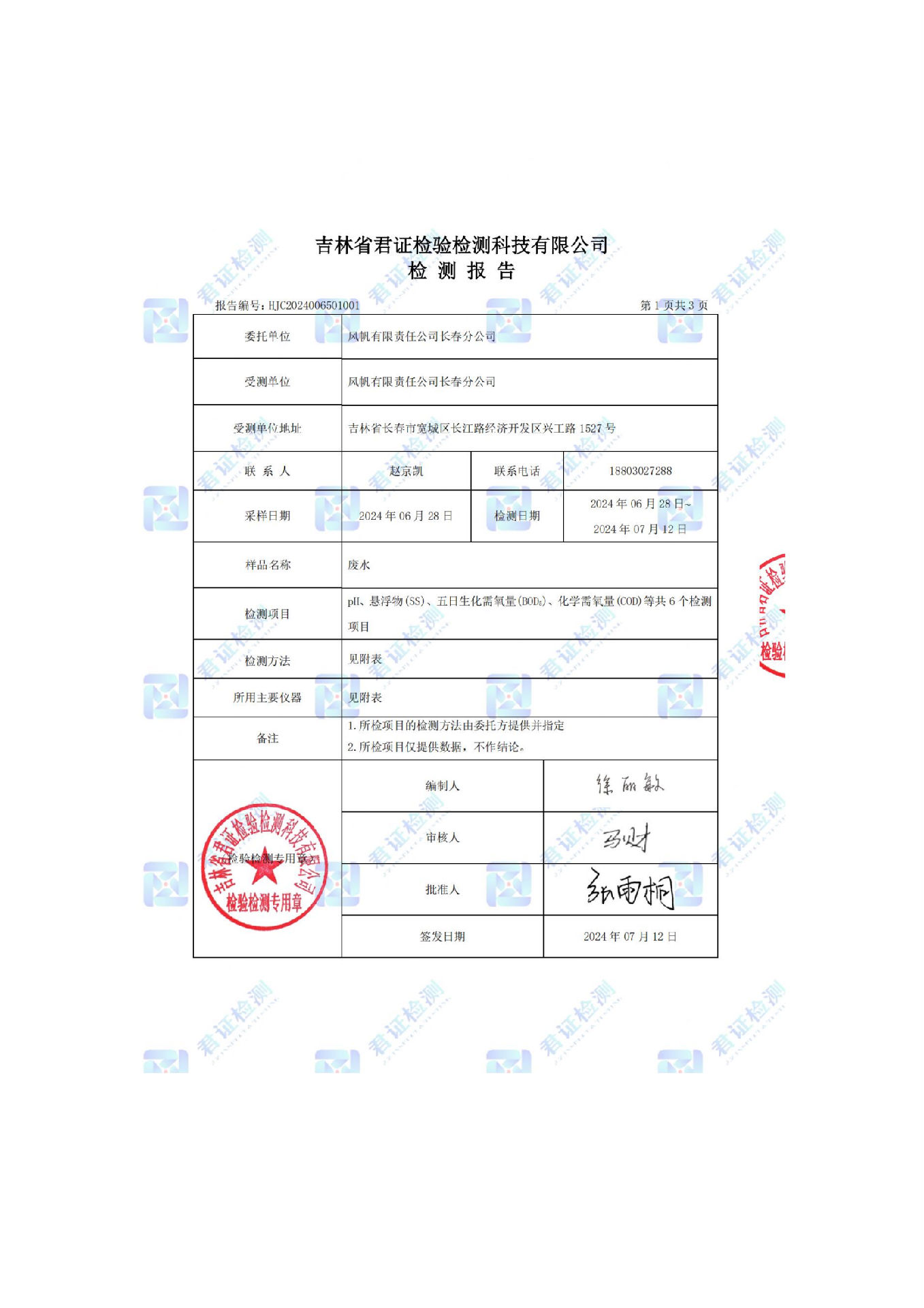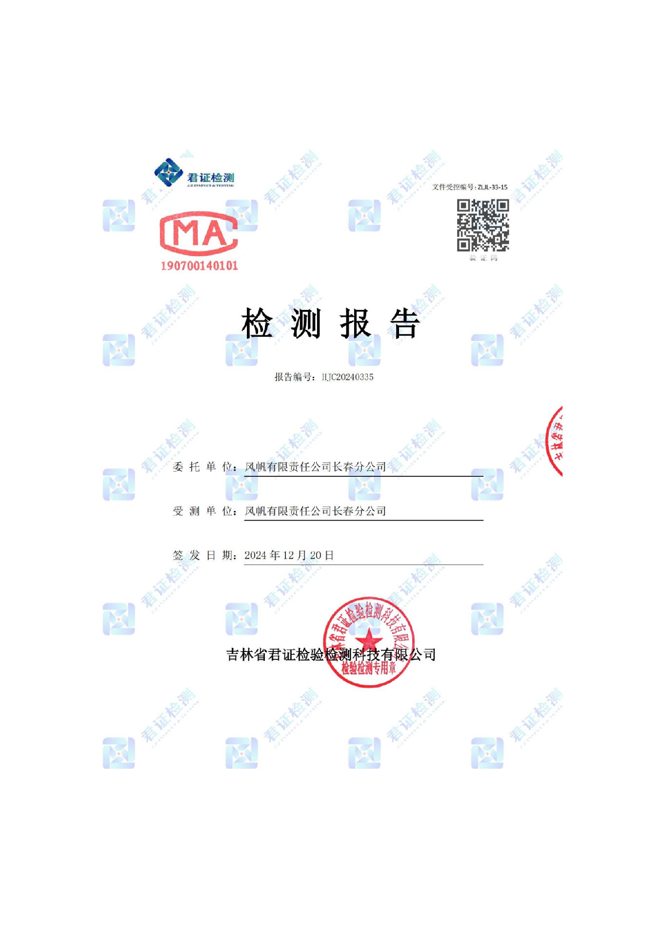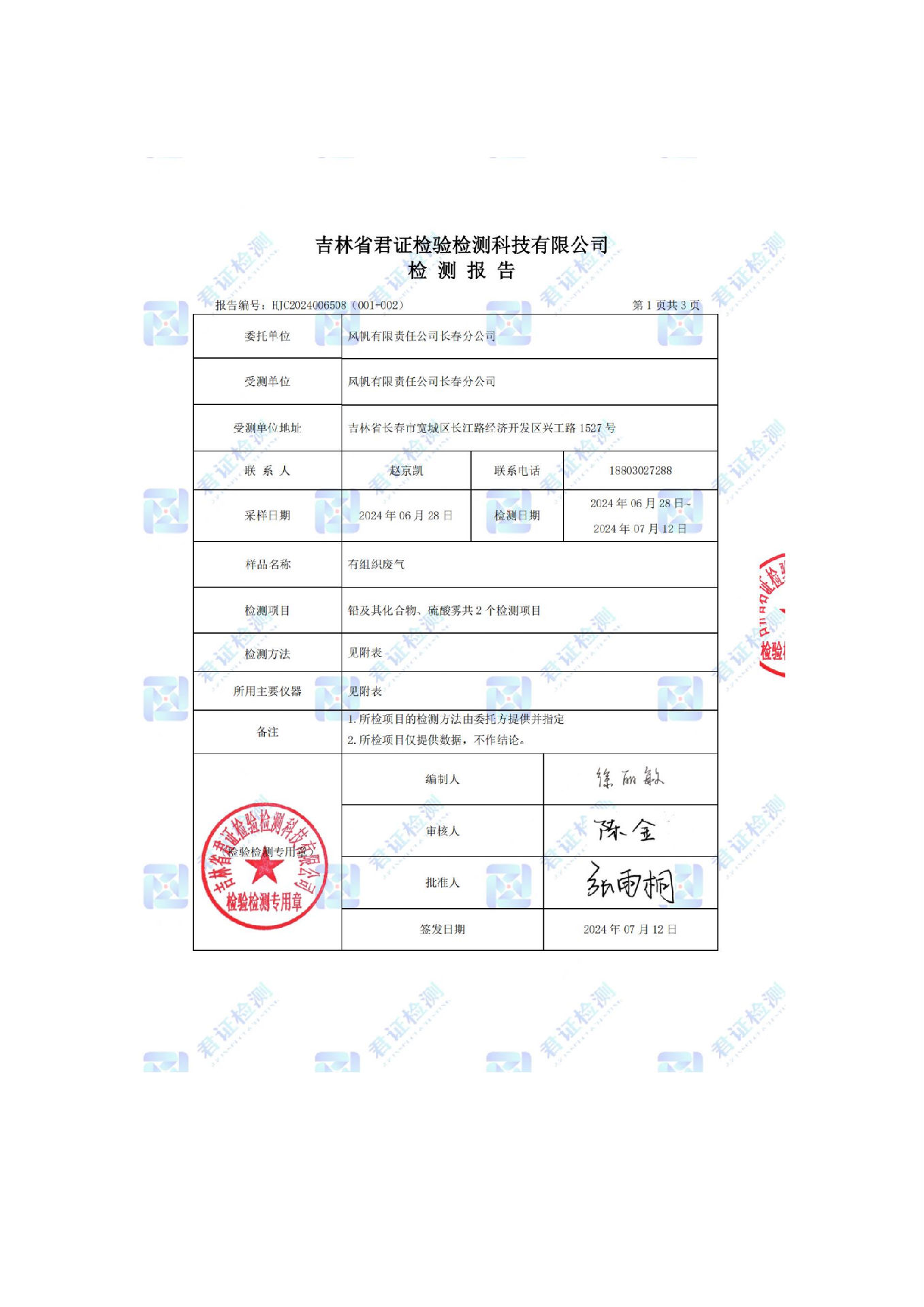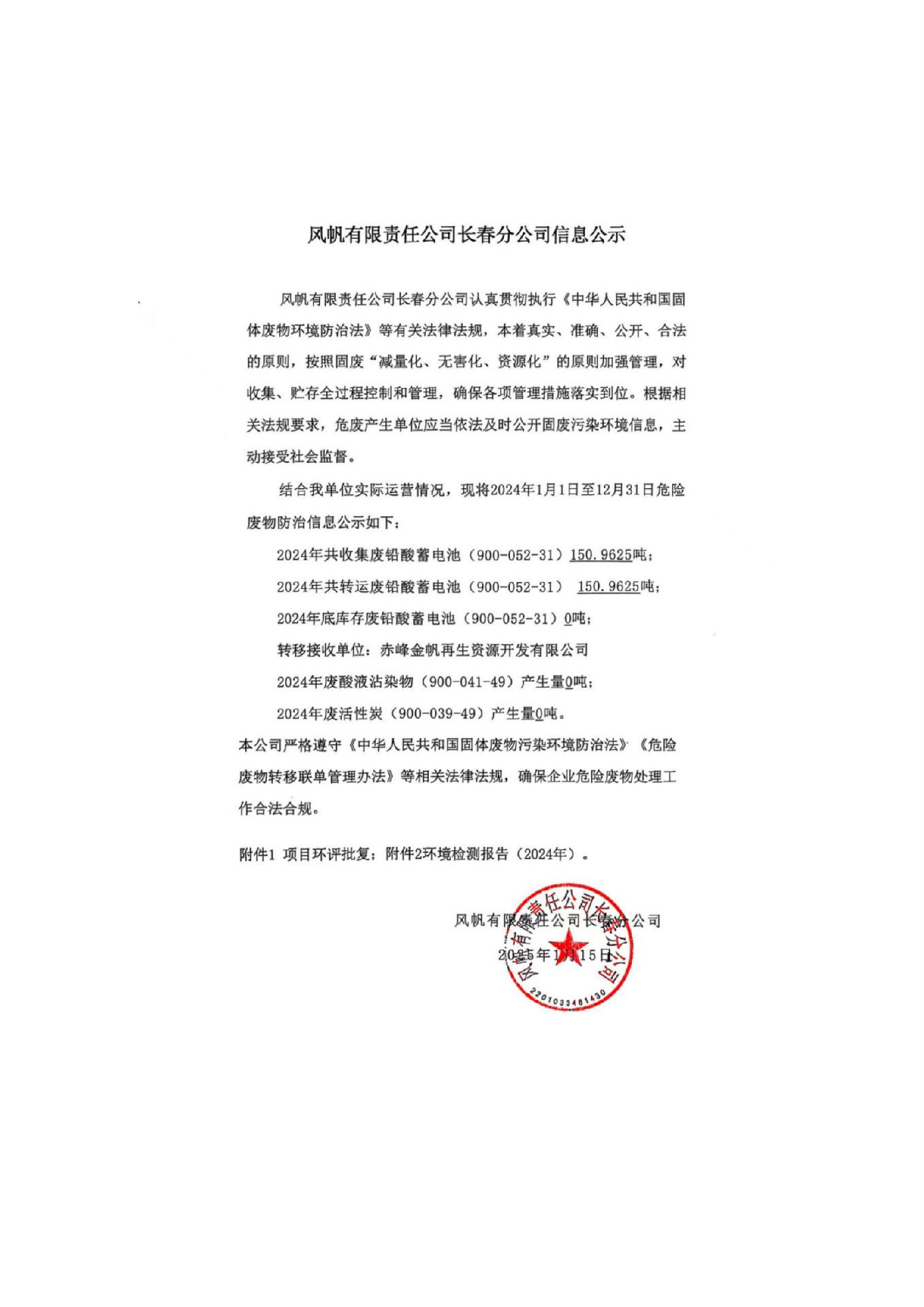 風帆有限責任公司長春分公司2024年危險廢物污染防治信息公示